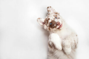 Funny studio portrait of the smilling puppy dog Australian Sheph
